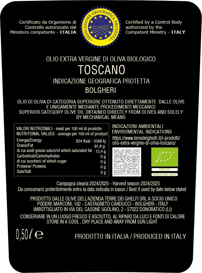 Frutto di una raccolta attenta e di una spremitura a freddo entro poche ore dalla raccolta, il nostro olio extravergine di oliva biologico Toscano IGP nasce per esprimere al meglio la qualità e la purezza del territorio di Castagneto Carducci e Bolgheri. Realizzato da olive delle varietà Frantoio, Moraiolo, Leccino e Razzo, coltivate con metodo biologico tra colline e uliveti accarezzati dalla brezza tirrenica, è un olio biologico che unisce armonia, eleganza e intensità.